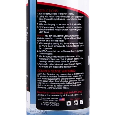 اسپری خنثی کننده بوی نامطبوع داخل خودرو 473 میلی لیتری آدامز مدل Adams Odor Neutralizer (Classic Fresh Scent) 473ml، یک محصول برای از بین بردن بوهای نامطبوع که در مدت طولانی در خودرو ایجاد شده است. مثلا اگر در خودرو زباله ای جا به ماند و فراموش شود برداشته شود؛ بوی آن در خودروی شما باقی میماند و سرنشینان خودرو را اذیت میکند. این محصول در تمامی سطوح پارچه ای مثل صندلی و کفپوش موکت و چرم قابل استفاده است و پس از استفاده هیچ گونه ردی از خود باقی نمیگذارد. برای استفاده از این محصول آن را در قسمتی که بوی نامطبوع وجود دارد اسپری کنید و اجازه دهید چند دقیقه بگذرد، سپس خواهید دید که بوی نامطبوع به طور کامل از بین رفته و حس طراوت و تازگی به خودروی شما برمیگردد.